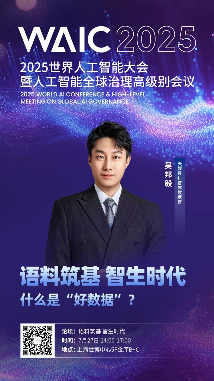 2025年7月26日至28日,世界人工智能大會(huì)(WAIC 2025)在上海世博中心盛大舉行。其間,天娛數(shù)科受邀出席7月27日下午的“語(yǔ)料筑基 智生時(shí)代”語(yǔ)料創(chuàng)新發(fā)展論壇,天娛數(shù)科首席數(shù)據(jù)官吳邦